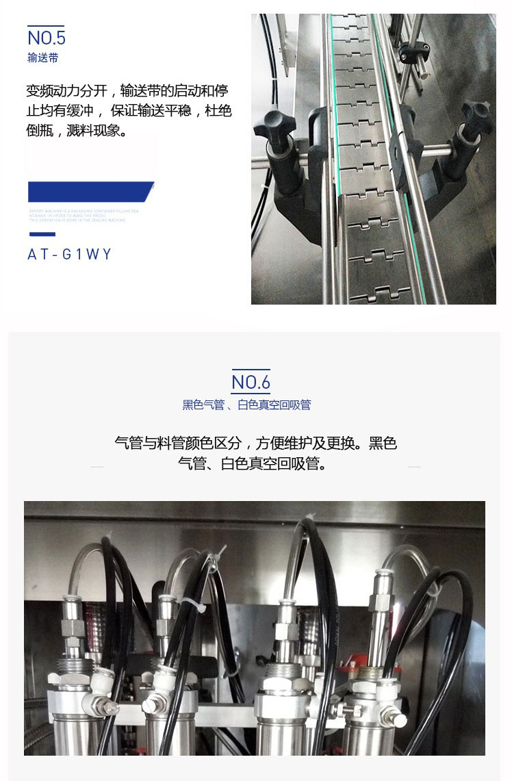該六頭柱塞式全自動潤滑油灌裝機特的灌裝頭設計及真空回吸系統(tǒng),確保灌裝過程無殘油滴漏,快慢雙速灌裝,灌裝速度可調(diào),杜絕溢瓶現(xiàn)象。該機采用動力灌裝,無需配裝高位罐,簡化了安裝工序,提高了灌裝效率。履帶式壓蓋機,穩(wěn)定無噪音,無空壓現(xiàn)象。觸摸屏界面友好,操作簡捷,SIEMENS PLC控制系統(tǒng),運算速度快,性能穩(wěn)定,品質(zhì)卓越。電、氣件均采用精品元件,確保整機運作穩(wěn)定。