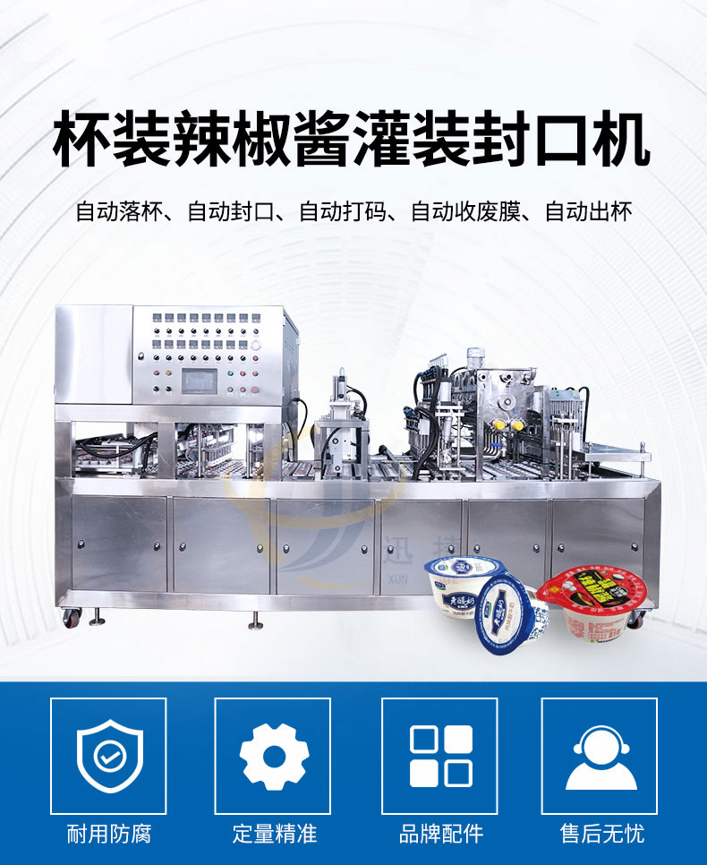 杯裝辣椒醬灌裝封口機適用于辣椒醬、黃豆醬、豆瓣醬、牛肉醬、沙拉醬等各種杯裝、盒裝等產品的生產。