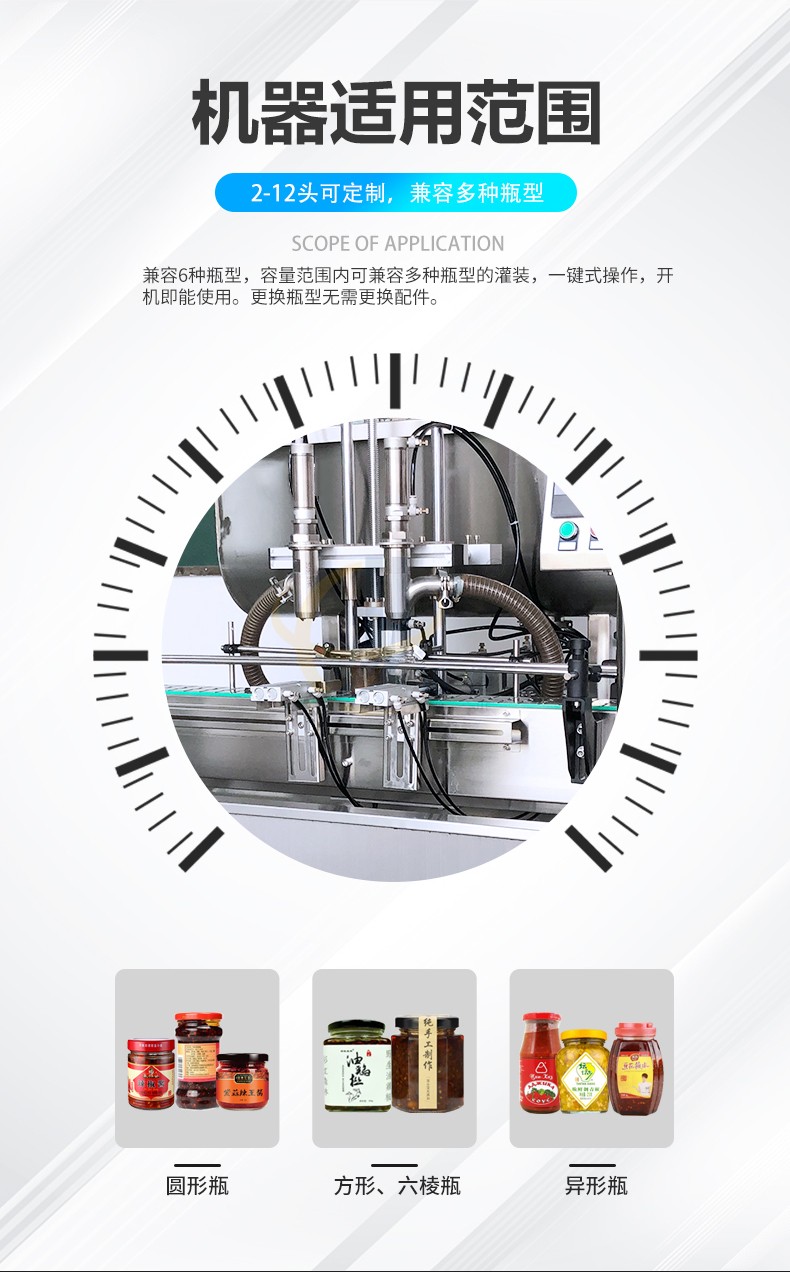 全自動雙頭醬料灌裝機(jī)兼容6種瓶型,容量范圍內(nèi)可兼容多種瓶型的灌裝,一鍵式操作,開機(jī)即能使用。更換瓶型無需更換配件。