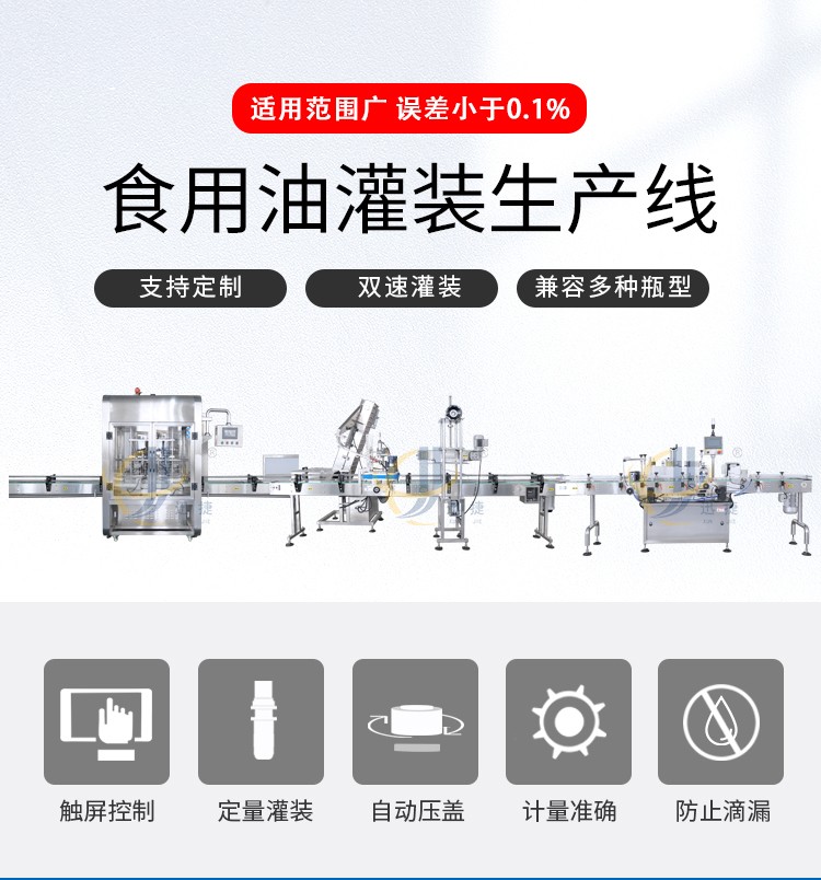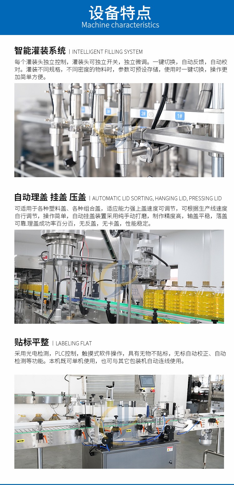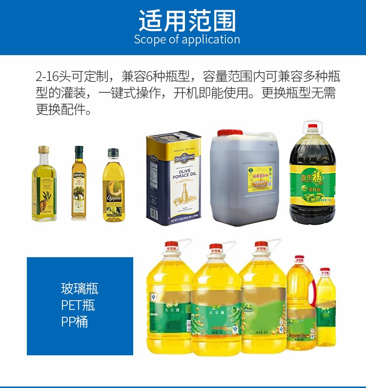 食用油灌裝生產(chǎn)線2-16頭可定制,兼容6種瓶型,容量范圍內(nèi)可兼容多種瓶型的灌裝,一鍵式操作,開機(jī)即能使用。
