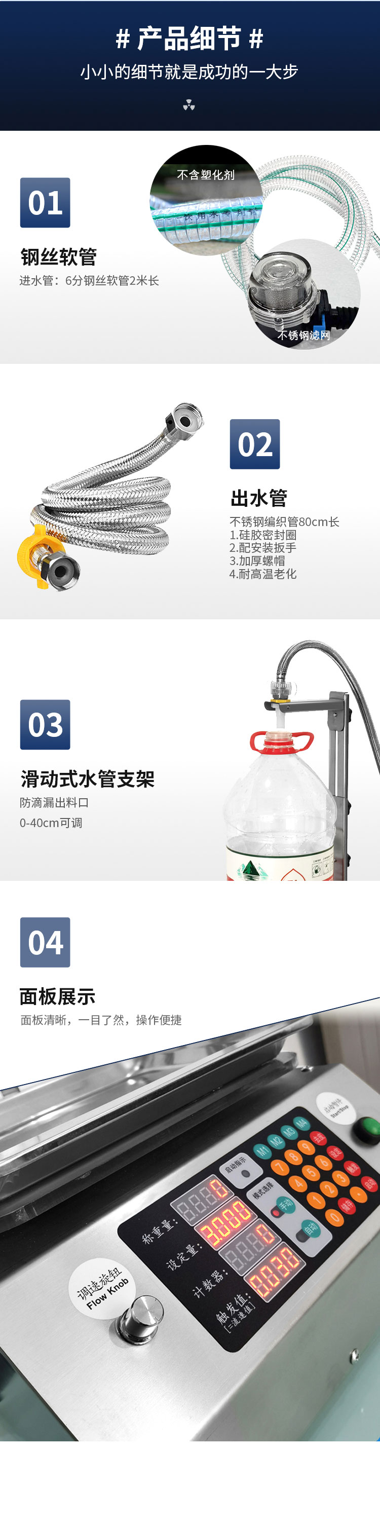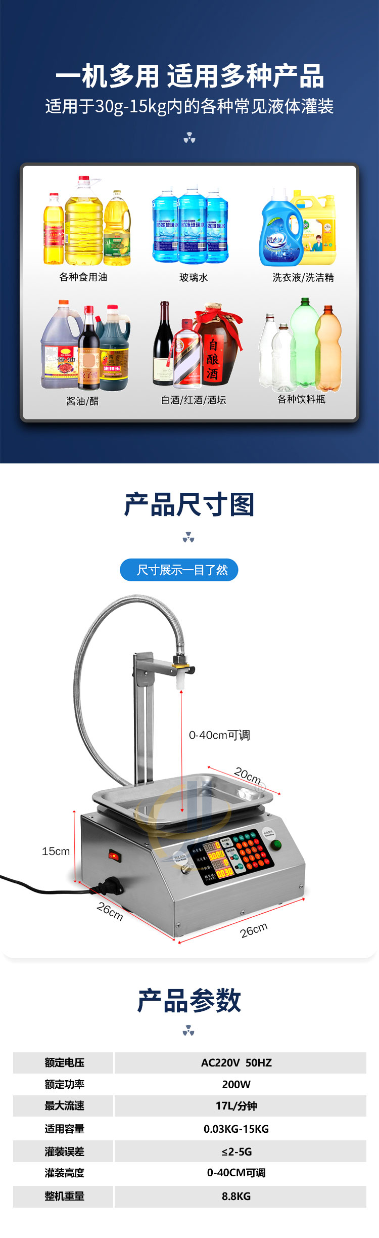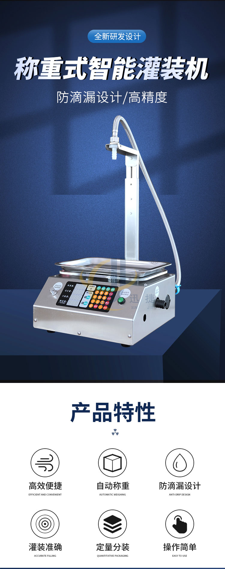 稱重式液體灌裝機適用于30g-15kg內(nèi)的各種常見液體灌裝。采用精度高,反應靈敏的電子秤作為計量標準。其性能可以超越所有時間定量的方式。