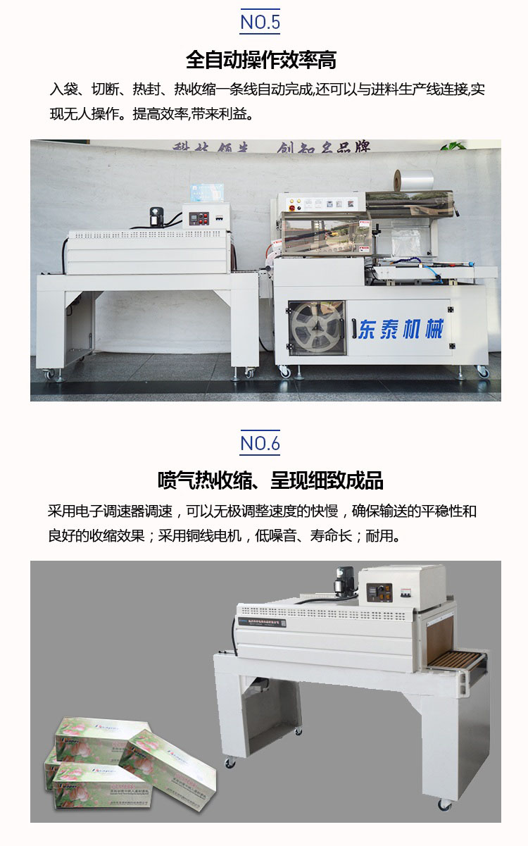 配合L型封切刀使收縮膜包裝一次封切成型,鍍特氟龍不粘層封口布,封切不黏膜,且封口整齊不開(kāi)裂,產(chǎn)品經(jīng)封切后,進(jìn)入自動(dòng)塑料膜熱收縮包裝機(jī)完成包裝。
