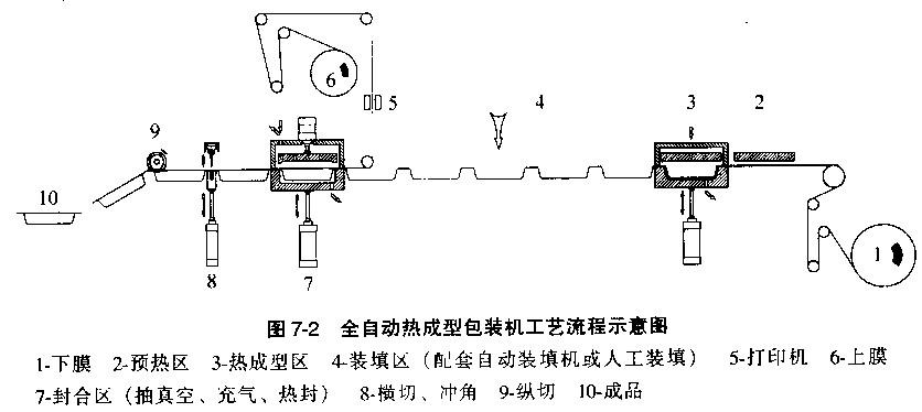如下圖所示是全自動(dòng)熱成型包裝機(jī)的包裝工藝流程示意圖。整機(jī)采用連續(xù)步進(jìn)的方式,由下卷膜成型,  上卷膜作封口。